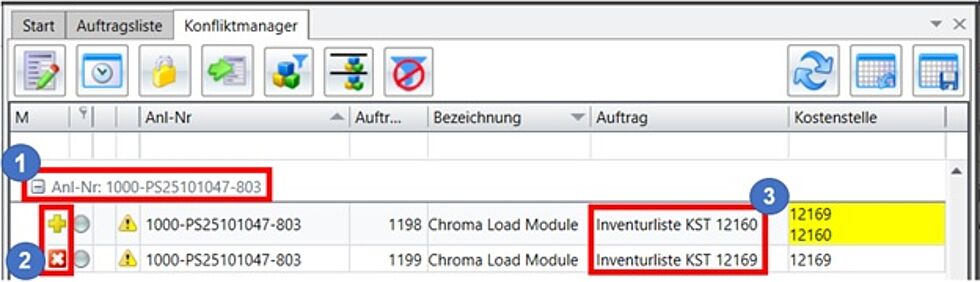 Der Konfliktmanager verdeutlicht Differenzen der durchgeführten Anlageninventur. Hierbei werden Anlagen angezeigt, welche in zwei oder mehr Inventuraufträgen enthalten sind. In der Ausgangssituation kann jede Anlage nur einmal in einem Inventurauftrag eingestellt sein, da das Anlagegut einem Bereich (Kostenstelle, Raum) zugeordnet ist. Hat das Anlagegut jedoch die Kostenstelle bzw. Raum gewechselt und wurde der Umzug der Buchhaltung nicht gemeldet, entsteht ein Konflikt, der manuell bewertet werden muss.
