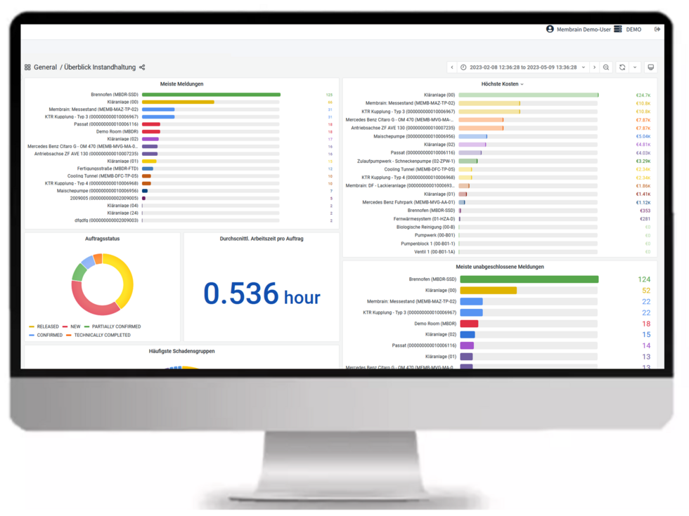 Mit MembrainPAS-PM Dashboard erhalten Sie eine schnelle, einfache und übersichtliche Darstellung der wichtigsten Kennzahlen (KPIs) und Daten.