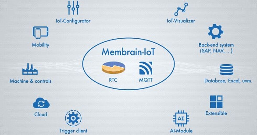 Nur ein ganzheitlicher Ansatz mit Vernetzung aller Systeme, Maschinen und Menschen erreicht eine Optimierung über den gesamten Wertschöpfungsprozess. Genau hier setzt die neue Membrain-IoT-Suite mit ihrem ganzheitlichen Digitalisierungsansatz an. Die Lösung dient u.a. als Bindeglied zwischen dem ERP-System (z.B. SAP) und den Maschinen und Steuerungen.